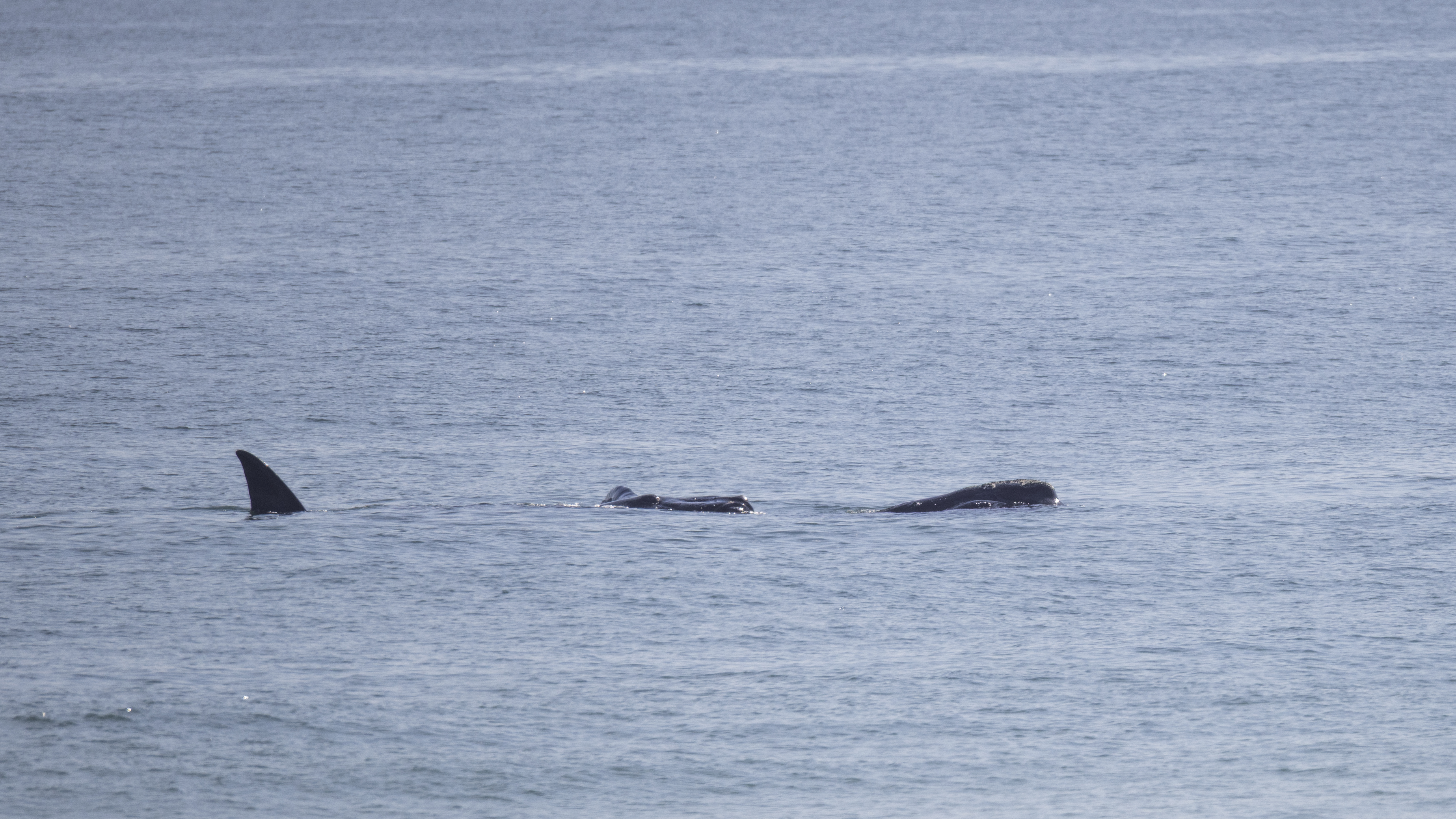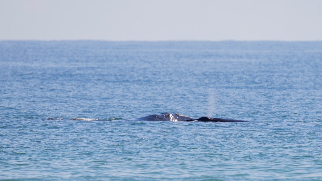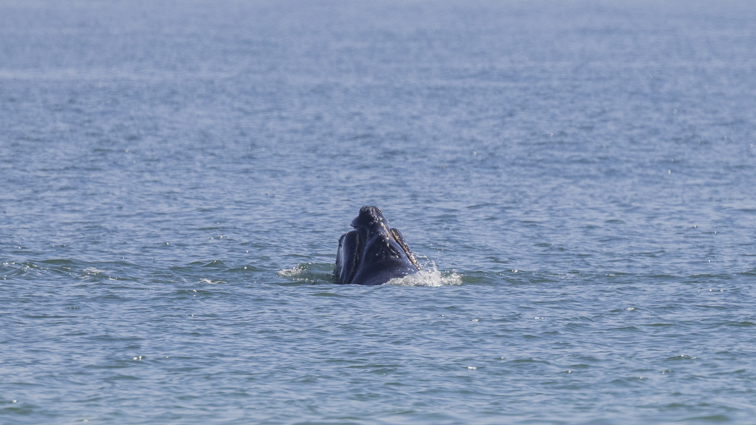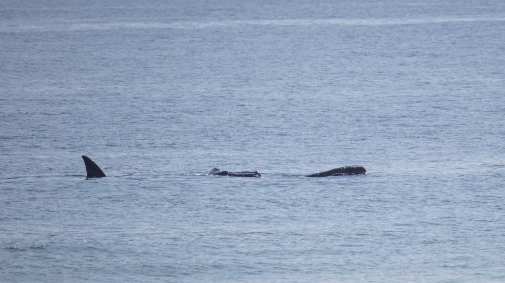 Momma right whales show only a small portion of their body as they lie in the water. They can be hard to spot. They do not jump up in the air like humpbacks or orcas. The baby whale may frolic in the water and expose its tail or flippers. Sometimes the momma whale will turn expose her large flippers. But, there is no dramatic whale display. There is just a momma right whale taking care of her newborn while it frolics and grows big enough to go back north in more food productive but colder waters.