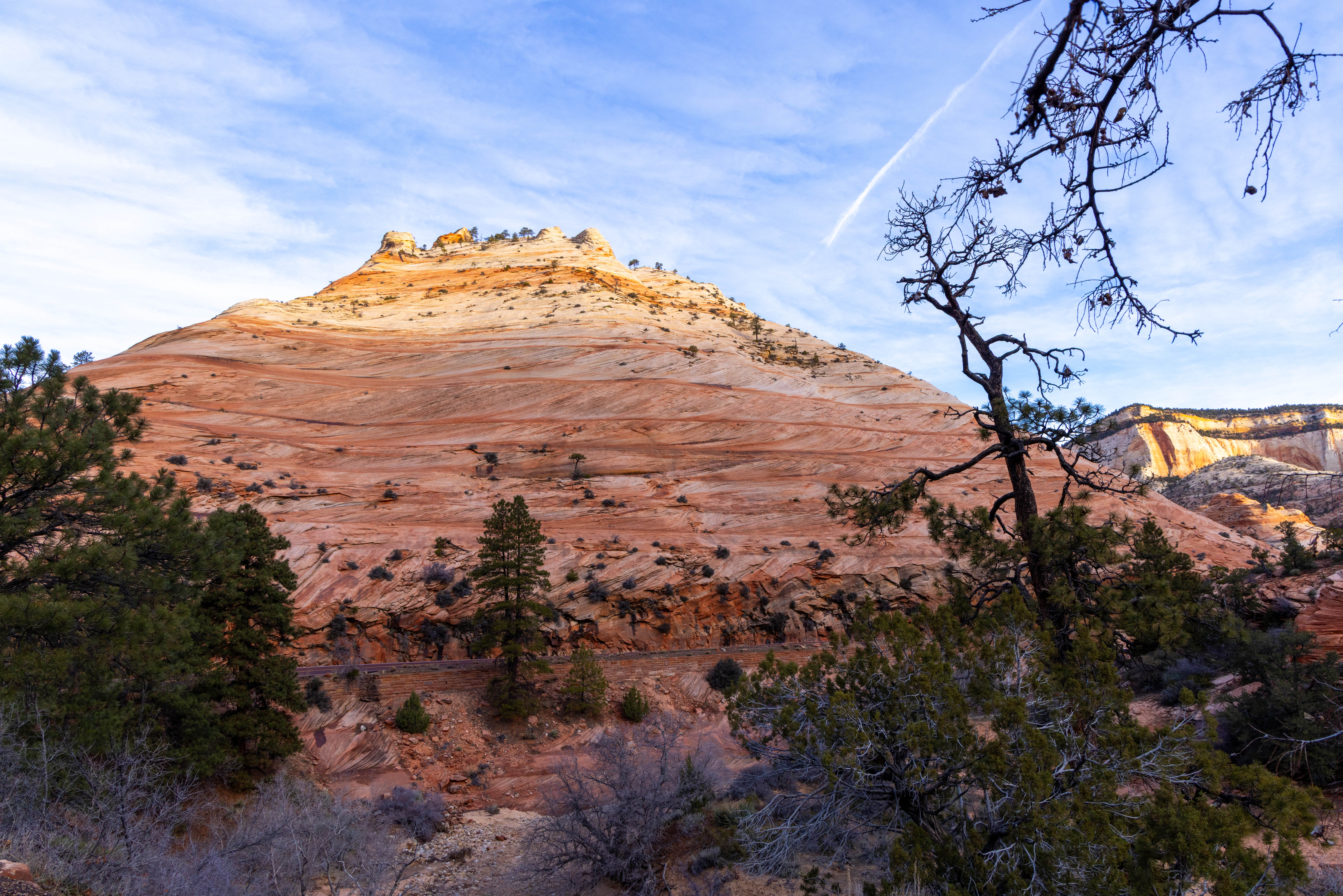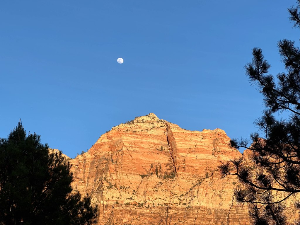Feeling better, Lynne and I headed east through Zion National Park early in the morning to look for wildlife. Our goal was to visit Coral Pink Sands State Park and then visit Best Friends Animal Sanctuary. We got good views of the morning sun lighting up some of the peaks in the park.