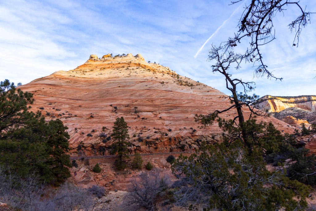 We arrived safely at our room in Springdale just as the sun was setting. The next day, we drove through Zion National Park to scope it out. We had plans to hike up Angel’s Landing even if we couldn’t make it to the top. During regular season, you can’t drive through the canyon. You must take the shuttle. The season starts March 7 so we were able to drive. We stopped at the Visitor Center on the way out and found that there was ice on the trail to Angel’s Landing and spikes were suggested. We both have them but left them at home. Also, there is a lottery to get to the top. The icy conditions nixed our plans. It is hard enough to do this without ice.