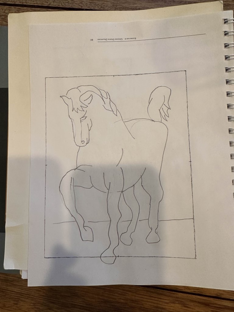 We were the first ones in and got taken care of with prescriptions to improve our situation. We stopped at Walgreens to pick them up and swallowed the first dose in the parking lot. By the time we got back to the lodge, we already felt better. The excursion was saved!! We lazed around all afternoon and I started to read a book on how to draw and it suggests drawing upside down. Here is one of my free hand drawings done upside down. I’m pretty excited that I may be able to improve on my non-existent drawing skills.