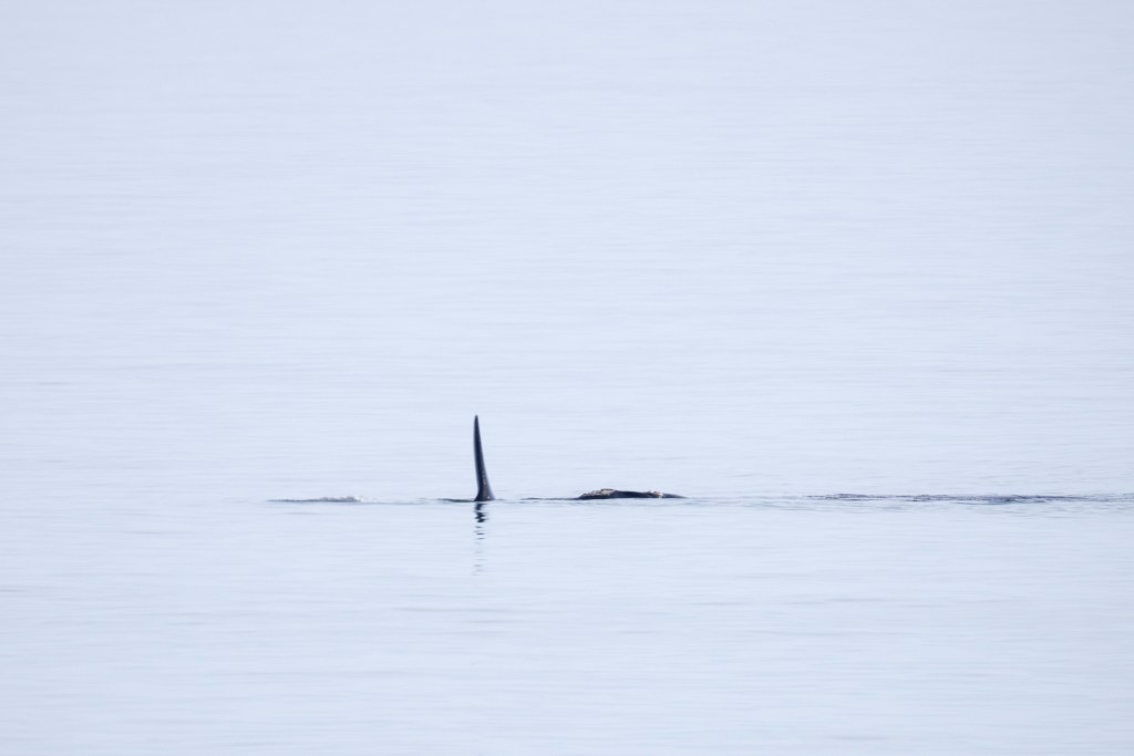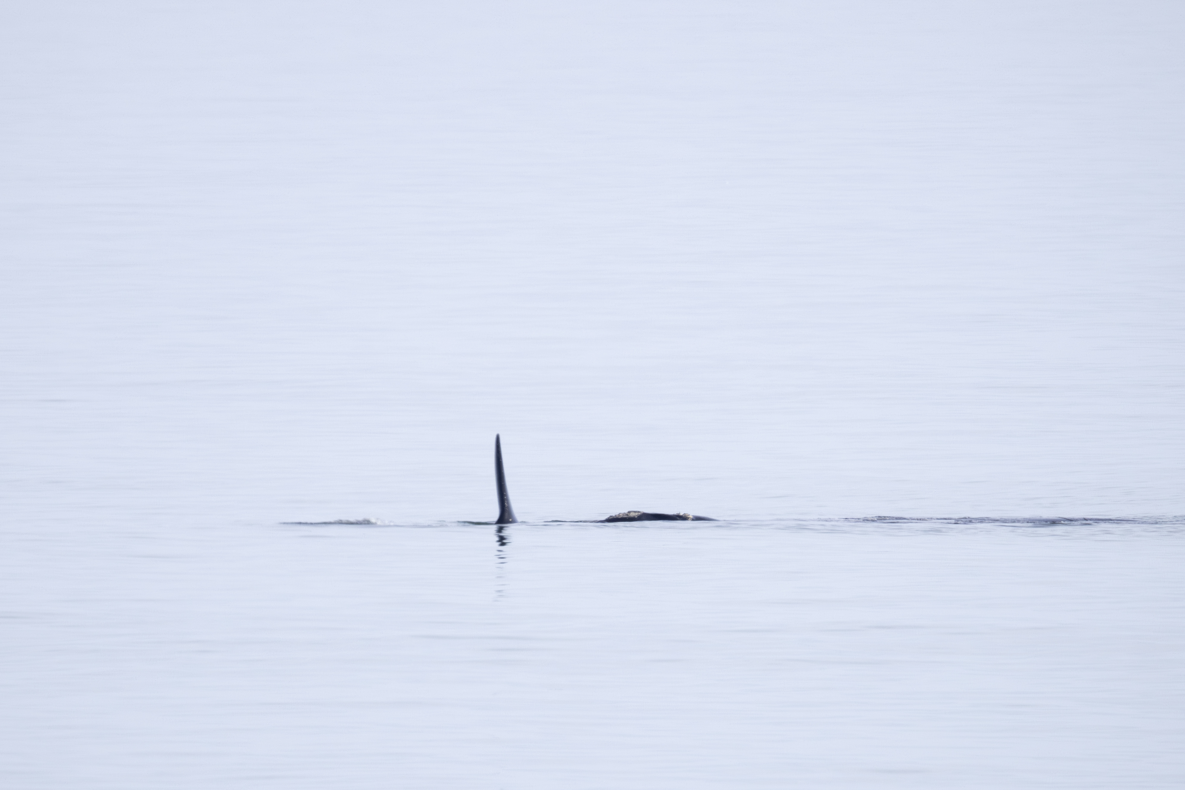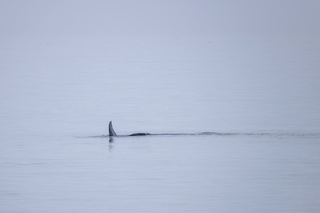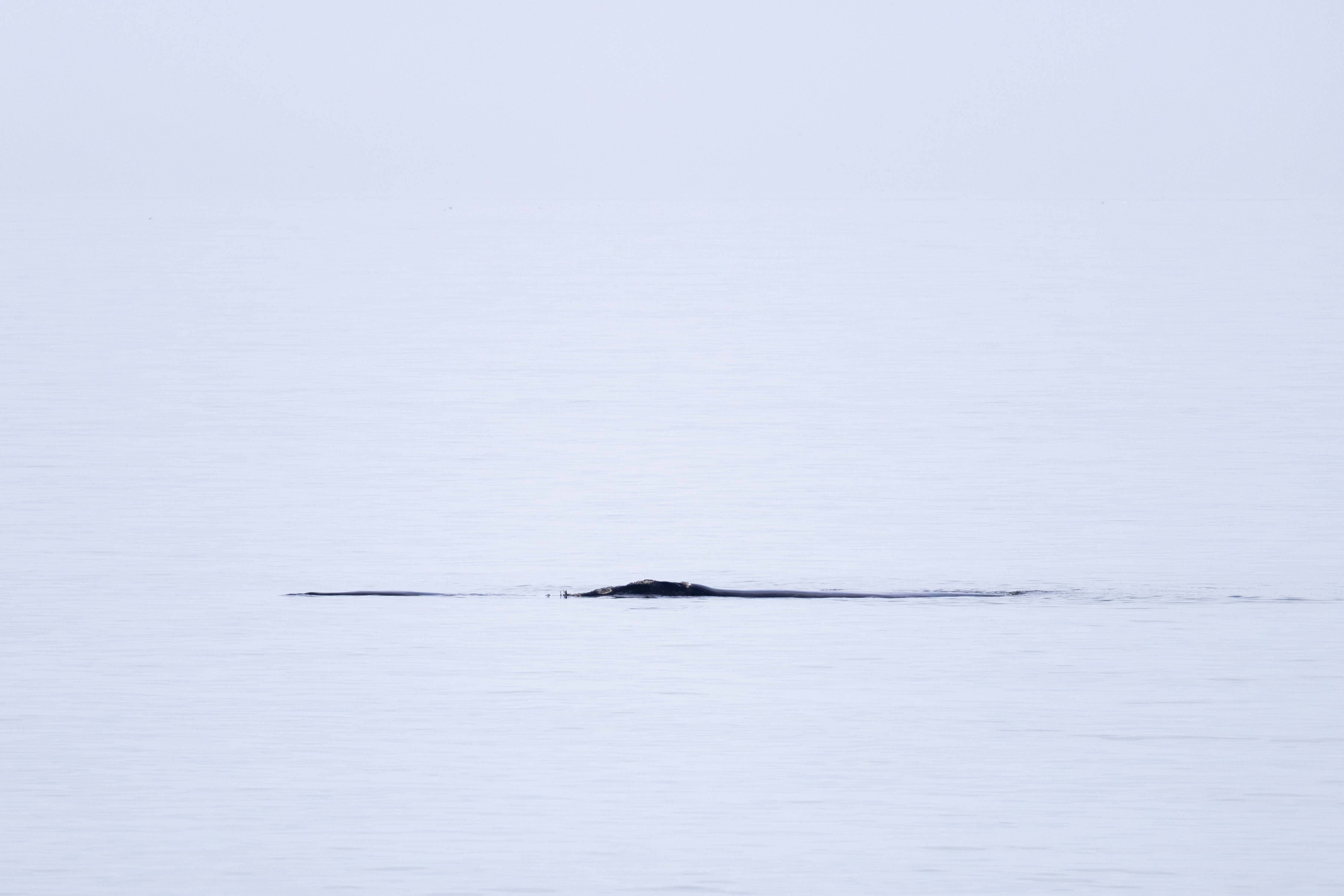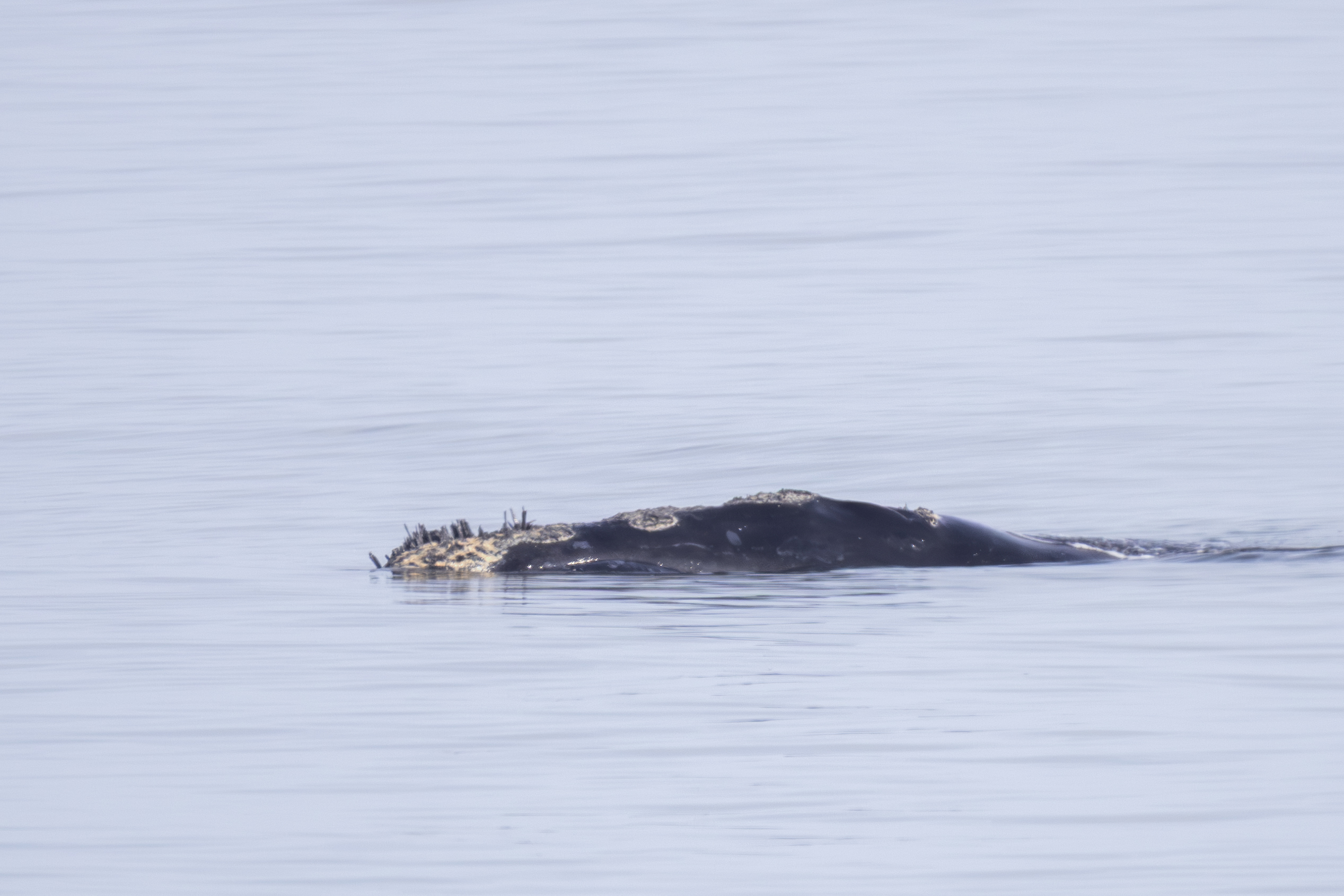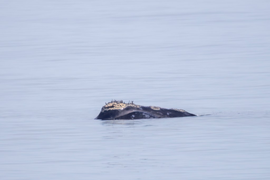 Momma right whales show only a small portion of their body as they lie in the water. They can be hard to spot. They do not jump up in the air like humpbacks or orcas. The baby whale may frolic in the water and expose its tail or flippers. Sometimes the momma whale will turn expose her large flippers. But, there is no dramatic whale display. There is just a momma right whale taking care of her newborn while it frolics and grows big enough to go back north in more food productive but colder waters.