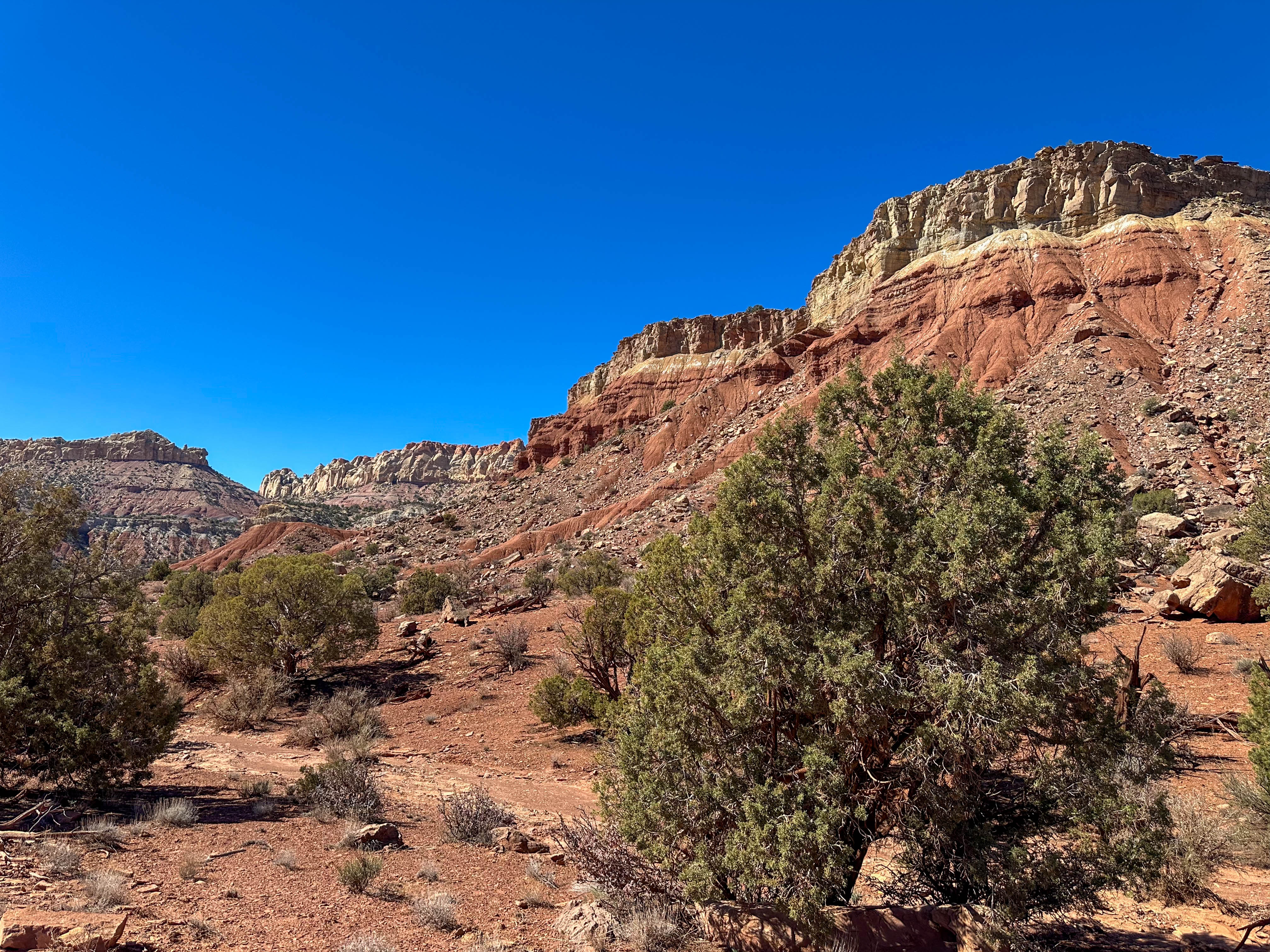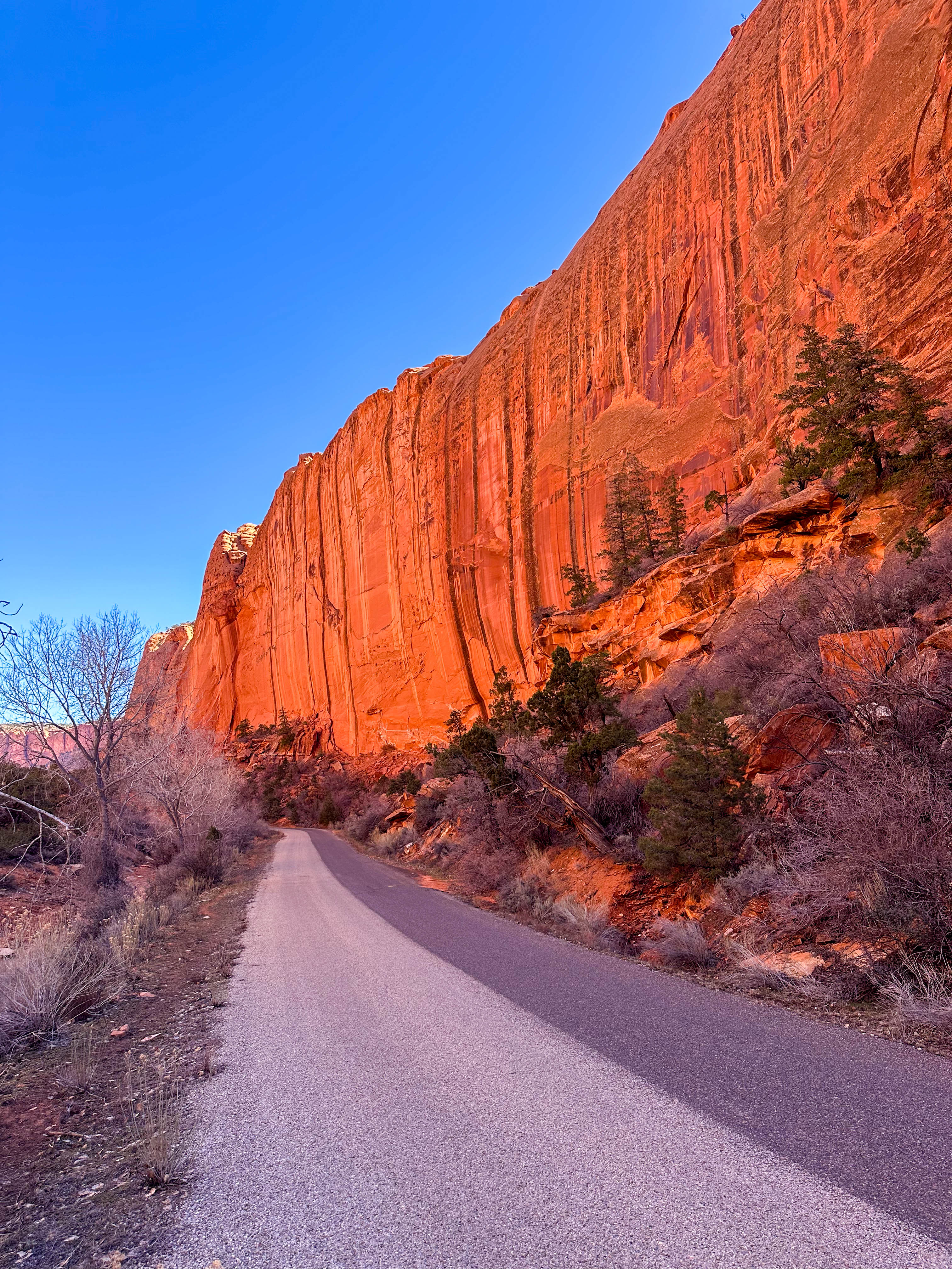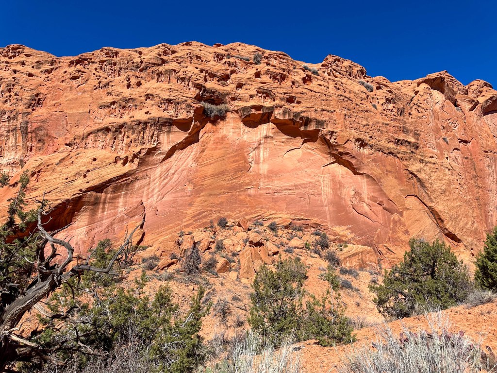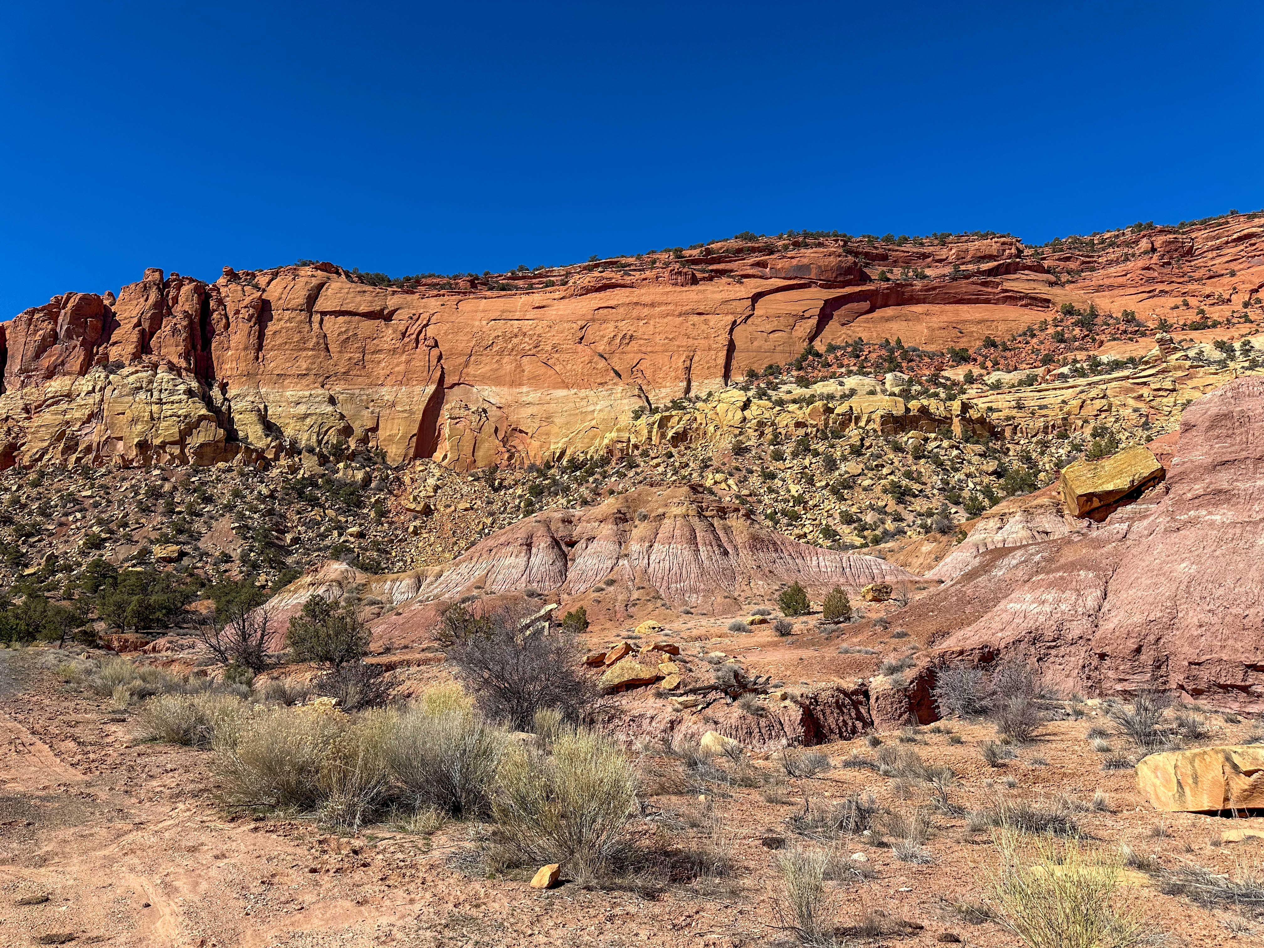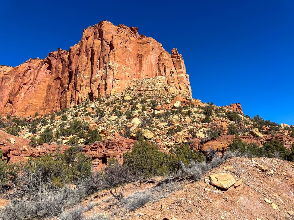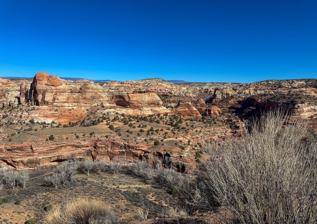 We turned off US 12 in Boulder to follow the Burr Trail through Long Canyon, a scenic backcountry route that winds from the edge of the Aquarius Plateau down through towering red-rock walls before crossing the Waterpocket Fold in Capitol Reef National Park and continuing toward Bullfrog on Lake Powell. The road begins as pavement in Boulder, climbing gently through sagebrush flats before entering Long Canyon, where sheer sandstone cliffs rise hundreds of feet above the road and massive fallen boulders create one of the most dramatic passages along the route. After going through Long Canyon, we only drove a few more miles before returning and saw sweeping views of the canyon country which we found nearly impossible to photograph because of the breadth of the landscape.